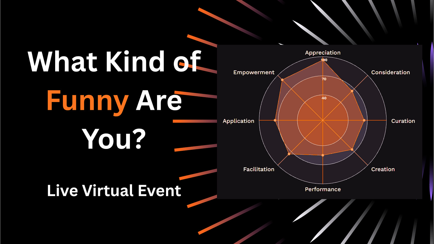 Next Wednesday, April 15th, I’m hosting a live workshop as part of International Humor Month. It’s called “What Kind of Funny Are You?” and the whole point is exactly what we’ve been talking about.