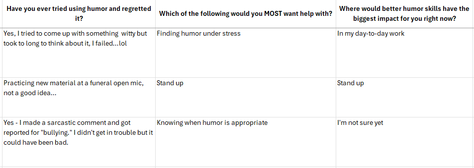 While there were definitely common themes (35% of you most want help finding humor under stress), everyone’s goal for using humor is a bit different.